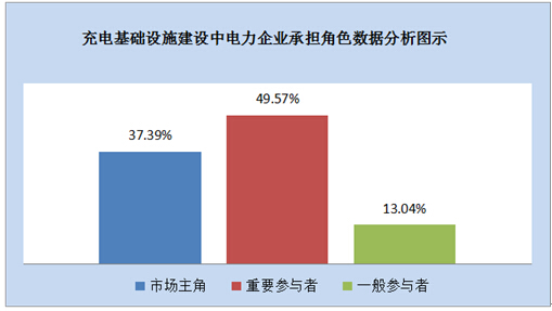 在电动汽车基础设施建设领域,电力企业与社会资本合作大幕已经开启,如何进一步深入,对电动汽车产业未来发展将起着重要的作用。调查数据显示,在充电桩建设中,认为电力企业是主角的占到了37.39%,认为是重要角色的占比为49.57%;认为是一般参与者的为13.04%。