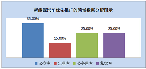 对于电动汽车适合推广的领域,调查数据显示,认为电动汽车首先应在公交车领域推广的占比为35%,出租车领域为15%,公务车领域的25%,私家车领域为25%。