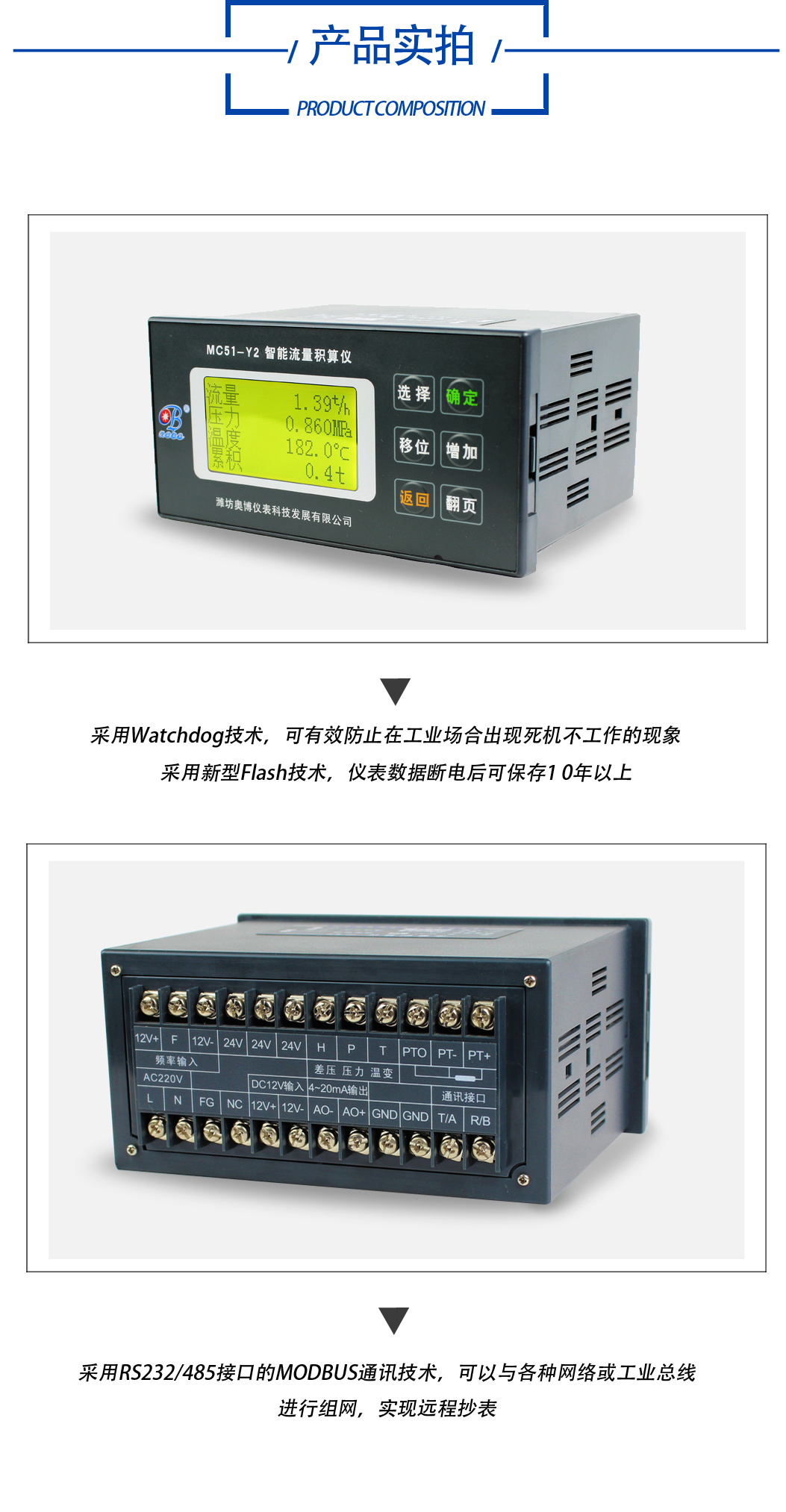 MC51-Y2智能流量积算仪是以超低功耗单片机为核心、智能型全中文菜单组态的通用型流量积算仪,以可靠的工作性能完成蒸汽、气体、液体的流量计量演算功能,能实时在线对流体的温度、压力进行补偿,能同时接收流量、温度、压力等信号,信号可以为频率、电流、差压、电阻等类型,信号处理采用无开关触点、无电位器可调部件技术,使得计量更准确,工作更可靠。