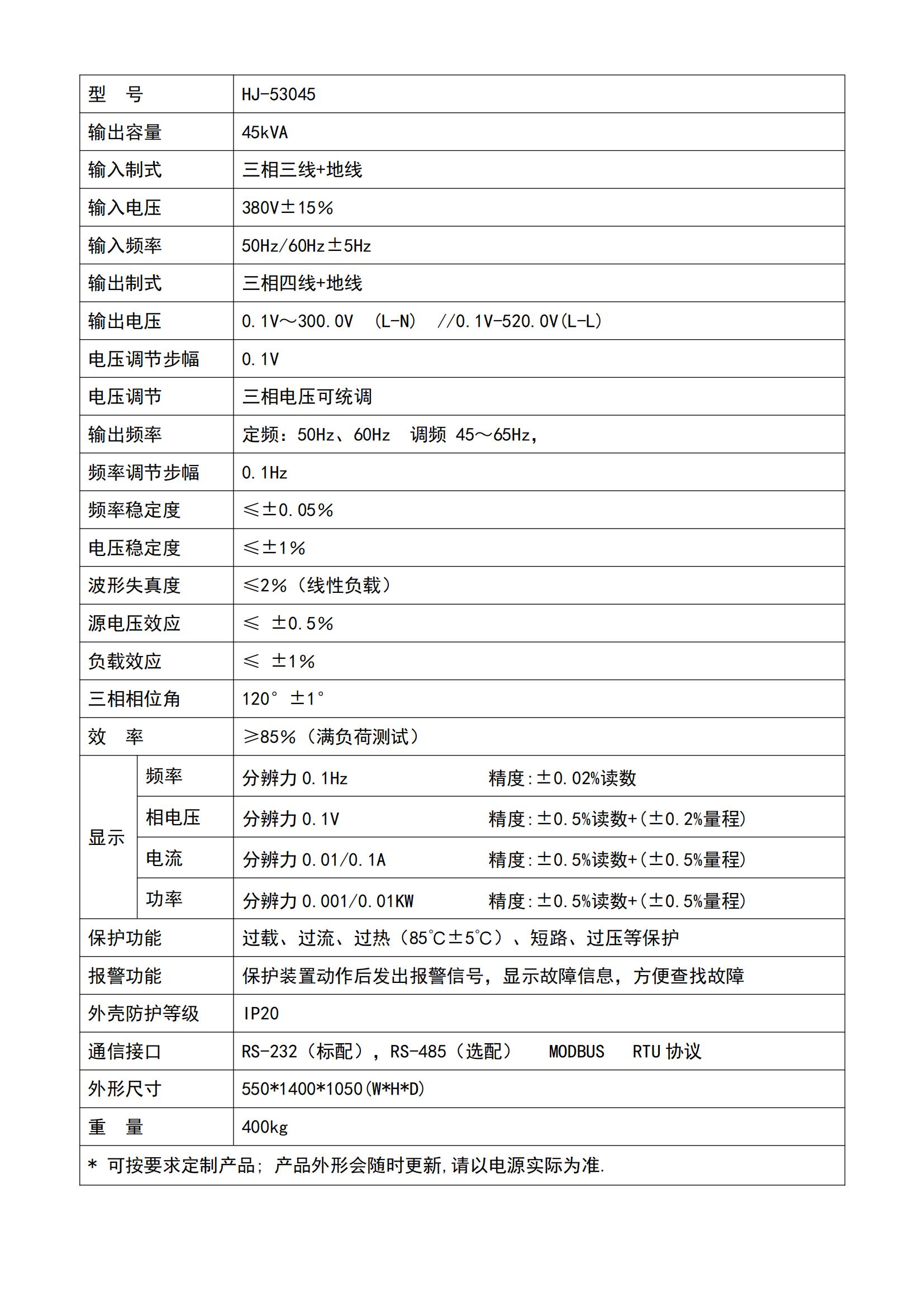 输出频率 定频:50Hz、60Hz 调频 45~65Hz,